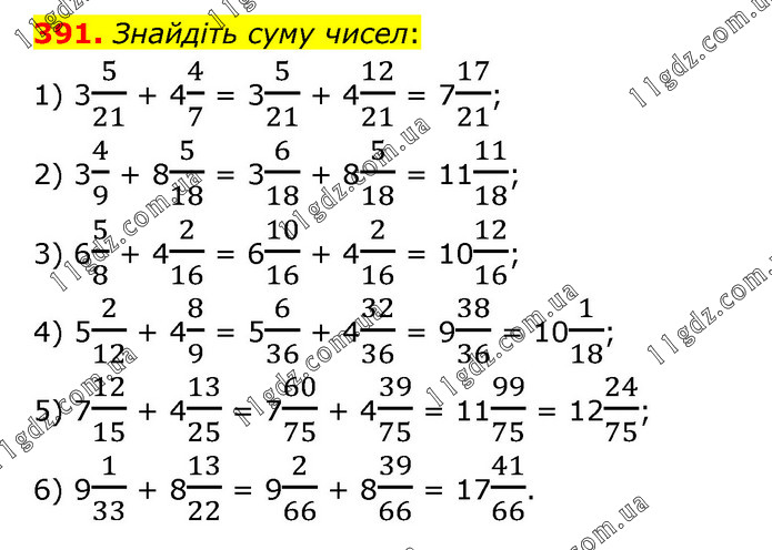 Знайдіть суму чисел: 1) 35/21 + 44/7 = 35/21 + 412/21 = 717/21; 2) 34/9 + 85/18 = 36/18 + 85/18 = 1111/18; 3) 65/8 + 42/16 = 610/16 + 42/16 = 1012/16; 4) 52/12 + 48/9 = 56/36 + 432/36 = 938/36 = 101/18; 5) 712/15 + 413/25 = 760/75 + 439/75 = 1199/75 = 1224/75; 6) 91/33 + 813/22 = 92/66 + 839/66 = 1741/66.