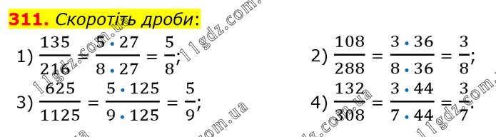 Скоротіть дроби: 1) 135/216 = (5 • 27)/(8 • 27) = 5/8; 2) 108/288 = (3 • 36)/(8 • 36) = 3/8; 3) 625/1125 = (5 • 125)/(9 • 125) = 5/9; 4) 132/308 = (3 • 44)/(7 • 44) = 3/7.