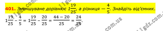 Зменшуване дорівнює 119/25, а різниця — 4/5. Знайдіть від’ємник. 119/25 – 4/5 = 119/25 – 20/25 = (44 - 20)/25 = 24/25.