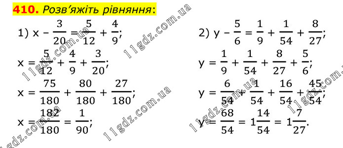 Розв’яжіть рівняння: 1) x – 3/20 = 5/12 + 4/9; x = 5/12 + 4/9 + 3/20; x = 75/180 + 80/180 + 27/180; x = 182/180 = 1/90; 2) y – 5/6 = 1/9 + 1/54 + 8/27; y = 1/9 + 1/54 + 8/27 + 5/6; y = 6/54 + 1/54 + 16/54 + 45/54; y = 68/54 = 114/54 = 17/27.
