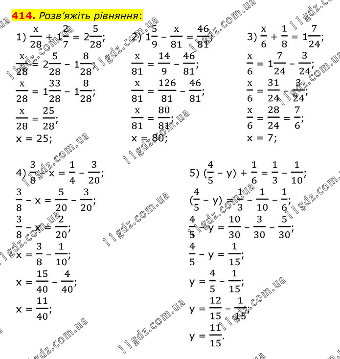 Розв’яжіть рівняння: 1) х/28 + 12/7 = 25/28; х/28 = 25/28 – 18/28; х/28 = 133/28 – 18/28; х/28 = 25/28; х = 25; 2) 15/9 – х/81 = 46/81; х/81 = 14/9 – 46/81; х/81 = 126/81 – 46/81; х/81 = 80/81; х = 80; 3) х/6 + 1/8 = 17/24; х/6 = 17/24 – 3/24; х/6 = 31/24 – 3/24; х/6 = 28/24 = 7/6; х = 7; 4) 3/8 – х = 1/4 – 3/20; 3/8 – х = 5/20 – 3/20; 3/8 – х = 2/20; х = 3/8 – 1/10; х = 15/40 – 4/40; х = 11/40; 5) (4/5 – у) + 1/6 = 1/3 – 1/10; (4/5 – у) = 1/3 – 1/10 – 1/6; 4/5 – у = 10/30 – 3/30 – 5/30; 4/5 – у = 1/15; у = 4/5 – 1/15; у = 12/15 – 1/15; у = 11/15.