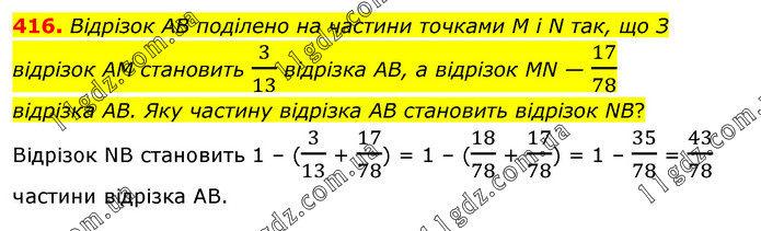 Відрізок AB поділено на частини точками M i N так, що З відрізок AM становить 3/13 відрізка AB, а відрізок MN — 17/78 відрізка AB. Яку частину відрізка AB становить відрізок NB? Відрізок NB становить 1 – (3/13 + 17/78) = 1 – (18/78 + 17/78) = 1 – 35/78 = 43/78 частини відрізка АВ.