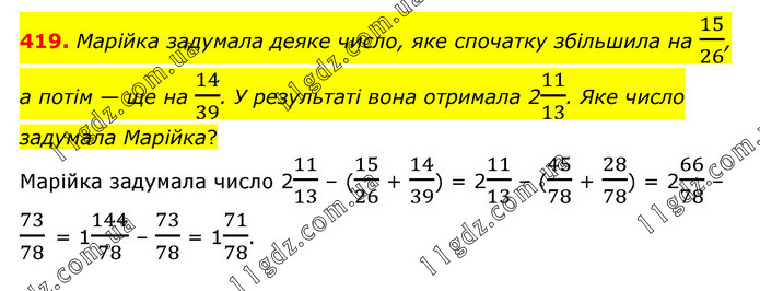 Марійка задумала деяке число, яке спочатку збільшила на 15/26, а потім — ще на 14/39. У результаті вона отримала 211/13. Яке число задумала Марійка? Марійка задумала число 211/13 – (15/26 + 14/39) = 211/13 – (45/78 + 28/78) = 266/78 – 73/78 = 1144/78 – 73/78 = 171/78.
