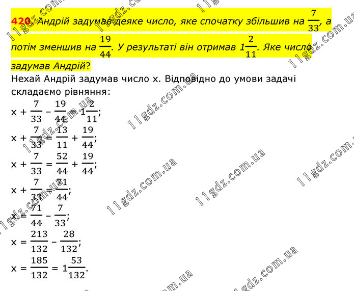 Андрій задумав деяке число, яке спочатку збільшив на 7/33, а потім зменшив на 19/44. У результаті він отримав 12/11. Яке число задумав Андрій? Нехай Андрій задумав число х. Відповідно до умови задачі складаємо рівняння: х + 7/33 – 19/44 = 12/11; х + 7/33 = 13/11 + 19/44; х + 7/33 = 52/44 + 19/44; х + 7/33 = 71/44; х = 71/44 – 7/33; х = 213/132 – 28/132; х = 185/132 = 153/132.