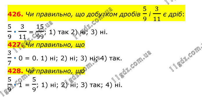 426. Чи правильно, що добутком дробів 5/9 і 3/11 є дріб: 5/9 ∙ 3/11 = 15/99; 1) так 2) ні; 3) ні. 427. Чи правильно, що 3/7 ∙ 0 = 0. 1) ні; 2) ні; 3) ні; 4) так. 428. Чи правильно, що 5/9 ∙ 1 = 5/9; 1) ні; 2) ні; З) так; 4) ні.