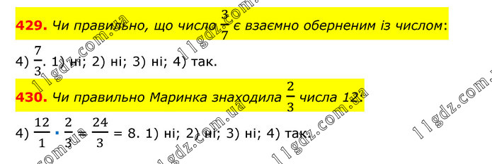429. Чи правильно, що число 3/7 є взаємно оберненим із числом: 4) 7/3. 1) ні; 2) ні; 3) ні; 4) так. 430. Чи правильно Маринка знаходила 2/3 числа 12: 4) 12/1 ∙ 2/3 = 24/3 = 8. 1) ні; 2) ні; 3) ні; 4) так.