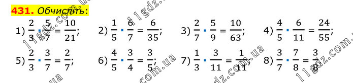 Обчисліть: 1) 2/3 ∙ 5/7 = 10/21; 2) 1/5 ∙ 6/7 = 6/35; 3) 2/7 ∙ 5/9 = 10/63; 4) 4/5 ∙ 6/11 = 24/55; 5) 2/3 ∙ 3/7 = 2/7; 6) 4/5 ∙ 3/4 = 3/5; 7) 1/3 ∙ 3/11 = 1/11; 8) 3/7 ∙ 7/8 = 3/8.