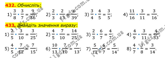 432. Обчисліть: 1) 3/8 ∙ 3/7 = 9/56; 2) 2/3 ∙ 2/13 = 6/39; 3) 3/4 ∙ 4/5 = 3/5; 4) 11/16 ∙ 3/11 = 3/16. 433. Знайдіть значення виразу: 1) 2/5 ∙ 3/10 = 3/25; 2) 4/5 ∙ 7/10 = 14/25; 3) 2/3 ∙ 6/7 = 4/7; 4) 4/(9 ) ∙ 3/11 = 4/33; 5) 4/5 ∙ 7/12 = 7/15; 6) 10/13 ∙ 7/10 = 7/13; 7) 5/12 ∙ 6/7 = 5/14; 8) 4/7 ∙ 3/8 = 3/14.