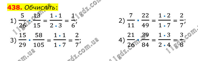 Обчисліть: 1) 5/26 ∙ 13/15 = (1 • 1)/(2 • 3) = 1/6; 2) 7/11 ∙ 22/49 = (1 • 2)/(1 • 7) = 2/7; 3) 15/29 ∙ 58/105 = (1 • 1)/(1 • 7) = 2/7; 4) 21/26 ∙ 39/84 = (1 • 3)/(2 • 4) = 3/8.