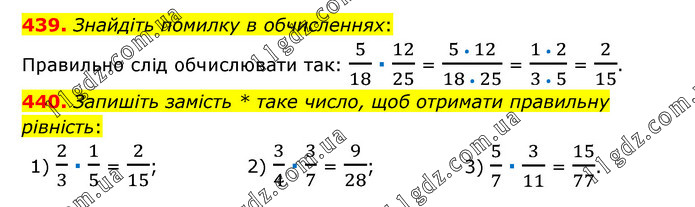 439. Знайдіть помилку в обчисленнях: Правильно слід обчислювати так: 5/18 ∙ 12/25 = (5 • 12)/(18 • 25) = (1 • 2)/(3 • 5) = 2/15. 440. Запишіть замість * таке число, щоб отримати правильну рівність: 1) 2/3 ∙ 1/5 = 2/15; 2) 3/4 ∙ 3/7 = 9/28; 3) 5/7 ∙ 3/11 = 15/77.