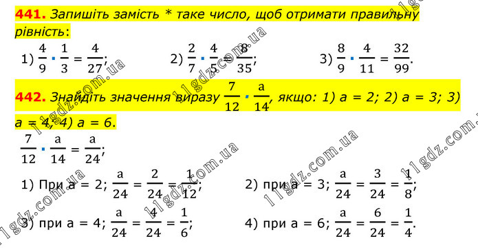 441. Запишіть замість * таке число, щоб отримати правильну рівність: 1) 4/9 ∙ 1/3 = 4/27; 2) 2/7 ∙ 4/5 = 8/35; 3) 8/9 ∙ 4/11 = 32/99. 442. Знайдіть значення виразу 7/12 ∙ а/14, якщо: 1) а = 2; 2) а = 3; 3) а = 4; 4) а = 6. 7/12 ∙ а/14 = а/24; 1) При а = 2; а/24 = 2/24 = 1/12; 2) при а = 3; а/24 = 3/24 = 1/8; 3) при а = 4; а/24 = 4/24 = 1/6; 4) при а = 6; а/24 = 6/24 = 1/4.