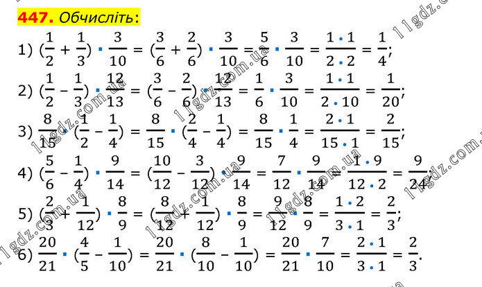 Обчисліть: 1) (1/2 + 1/3) ∙ 3/10 = (3/6 + 2/6) ∙ 3/10 = 5/6 ∙ 3/10 = (1 • 1)/(2 • 2) = 1/4; 2) (1/2 – 1/3) ∙ 12/13 = (3/6 – 2/6) ∙ 12/13 = 1/6 ∙ 3/10 = (1 • 1)/(2 • 10) = 1/20; 3) 8/15 ∙ (1/2 – 1/4) = 8/15 ∙ (2/4 – 1/4) = 8/15 ∙ 1/4 = (2 • 1)/(15 • 1) = 2/15; 4) (5/6 – 1/4) ∙ 9/14 = (10/12 – 3/12) ∙ 9/14 = 7/12 ∙ 9/14 = (1 • 9)/(12 • 2) = 9/24; 5) (2/3 + 1/12) ∙ 8/9 = (8/12 + 1/12) ∙ 8/9 = 9/12 ∙ 8/9 = (1 • 2)/(3 • 1) = 2/3; 6) 20/21 ∙ (4/5 – 1/10) = 20/21 ∙ (8/10 – 1/10) = 20/21 ∙ 7/10 = (2 • 1)/(3 • 1) = 2/3.