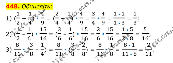 Обчисліть: 1) (1/2 + 1/4) ∙ 4/9 = (2/4 + 1/4) ∙ 4/9 = 3/4 ∙ 4/9 = (1 • 1)/(1 • 3) = 1/3; 2) (1/2 – 1/6) ∙ 15/16 = (3/6 – 1/6) ∙ 15/16 = 2/6 ∙ 15/16 = (1 • 5)/(2 • 8) = 5/16; 3) 8/11 ∙ (3/8 – 1/4) = 8/11 ∙ (3/8 – 2/8) = 8/11 ∙ 1/8 = (8 • 1)/(11 • 8) = 2/11.
