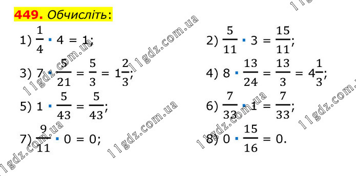 Обчисліть: 1) 1/4 ∙ 4 = 1; 3) 7 ∙ 5/21 = 5/3 = 12/3; 5) 1 ∙ 5/43 = 5/43; 7) 9/11 ∙ 0 = 0; 2) 5/11 ∙ 3 = 15/11; 4) 8 ∙ 13/24 = 13/3 = 41/3; 6) 7/33 ∙ 1 = 7/33; 8) 0 ∙ 15/16 = 0.