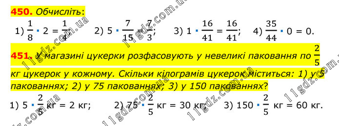 450. Обчисліть: 1) 1/8 ∙ 2 = 1/4; 2) 5 ∙ 7/15 = 7/3; 3) 1 ∙ 16/41 = 16/41; 4) 35/44 ∙ 0 = 0. 451. У магазині цукерки розфасовують у невеликі паковання по 2/5 кг цукерок у кожному. Скільки кілограмів цукерок міститься: 1) у 5 пакованнях; 2) у 75 пакованнях; 3) у 150 пакованнях? 1) 5 ∙ 2/5 кг = 2 кг; 2) 75 ∙ 2/5 кг = 30 кг; 3) 150 ∙ 2/5 кг = 60 кг.