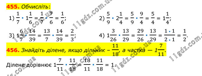 455. Обчисліть: 1) 1/7 ∙ 11/6 = 1/7 ∙ 7/6 = 1/6; 2) 5/9 ∙ 21/4 = 5/9 ∙ 9/4 = 5/4 = 11/4; 3) 16/7 ∙ 14/39 = 13/7 ∙ 14/39 = 2/3; 4) 13/26 ∙ 13/29 = 29/26 ∙ 13/29 = (1 • 1)/(2 • 1) = 1/2. 456. Знайдіть ділене, якщо дільник – 11/18, а частка — 17/11. Ділене дорівнює 17/11 ∙ 11/18 = 18/11 ∙ 11/18 = 1.