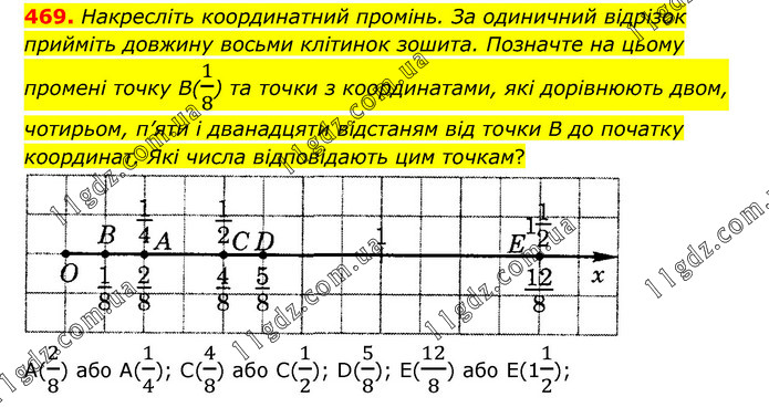 Накресліть координатний промінь. За одиничний відрізок прийміть довжину восьми клітинок зошита. Позначте на цьому промені точку В(1/8) та точки з координатами, які дорівнюють двом, чотирьом, п’яти і дванадцяти відстаням від точки В до початку координат. Які числа відповідають цим точкам? А(2/8) або А(1/4); С(4/8) або С(1/2); D(5/8); Е(12/8) або Е(11/2);