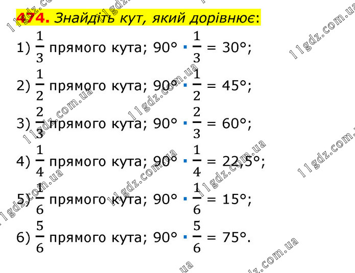 Знайдіть кут, який дорівнює: 1) 1/3 прямого кута; 90° ∙ 1/3 = 30°; 2) 1/2 прямого кута; 90° ∙ 1/2 = 45°; 3) 2/3 прямого кута; 90° ∙ 2/3 = 60°; 4) 1/4 прямого кута; 90° ∙ 1/4 = 22,5°; 5) 1/6 прямого кута; 90° ∙ 1/6 = 15°; 6) 5/6 прямого кута; 90° ∙ 5/6 = 75°.