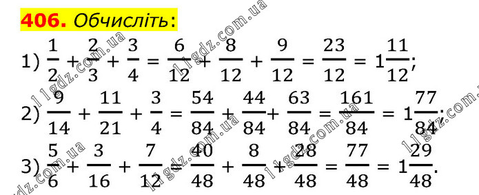 Обчисліть: 1) 1/2 + 2/3 + 3/4 = 6/12 + 8/12 + 9/12 = 23/12 = 111/12; 2) 9/14 + 11/21 + 3/4 = 54/84 + 44/84+ 63/84 = 161/84 = 177/84; 3) 5/6 + 3/16 + 7/12 = 40/48 + 8/48 + 28/48 = 77/48 = 129/48.