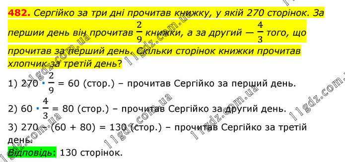 Сергійко за три дні прочитав книжку, у якій 270 сторінок. За першии день він прочитав 2/9 книжки, а за другий — 4/3 того, що прочитав за перший день. Скільки сторінок книжки прочитав хлопчик за третій день? 1) 270 ∙ 2/9 = 60 (стор.) – прочитав Сергійко за перший день. 2) 60 ∙ 4/3 = 80 (стор.) – прочитав Сергійко за другий день. 3) 270 – (60 + 80) = 130 (стор.) – прочитав Сергійко за третій день. Відповідь: 130 сторінок.