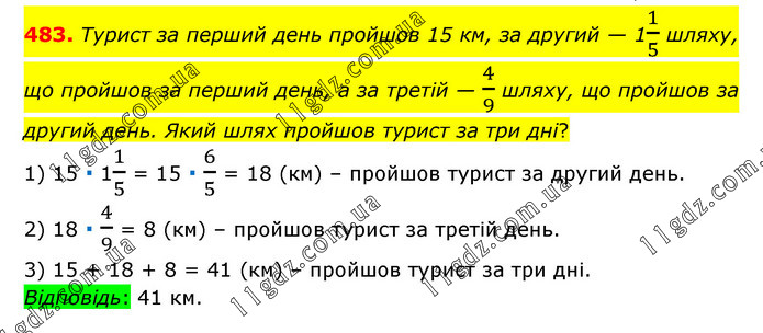 Турист за перший день пройшов 15 км, за другий — 11/5 шляху, що пройшов за перший день, а за третій — 4/9 шляху, що пройшов за другий день. Який шлях пройшов турист за три дні? 1) 15 ∙ 11/5 = 15 ∙ 6/5 = 18 (км) – пройшов турист за другий день. 2) 18 ∙ 4/9 = 8 (км) – пройшов турист за третій день. 3) 15 + 18 + 8 = 41 (км) – пройшов турист за три дні. Відповідь: 41 км.