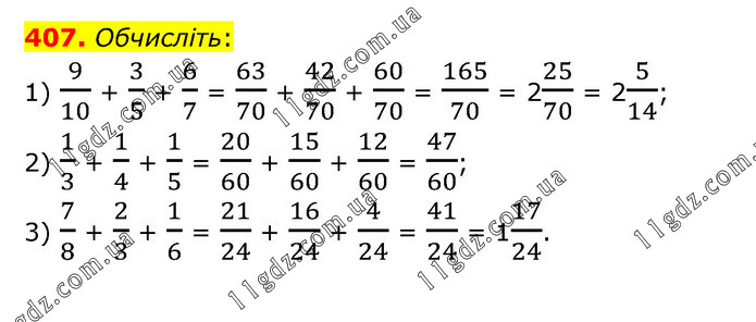 Обчисліть: 1) 9/10 + 3/5 + 6/7 = 63/70 + 42/70 + 60/70 = 165/70 = 225/70 = 25/14; 2) 1/3 + 1/4 + 1/5 = 20/60 + 15/60 + 12/60 = 47/60; 3) 7/8 + 2/3 + 1/6 = 21/24 + 16/24 + 4/24 = 41/24 = 117/24.