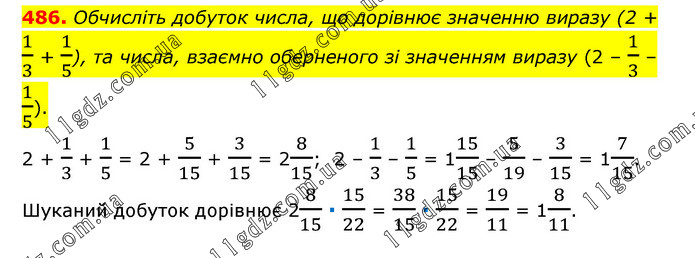Обчисліть добуток числа, що дорівнює значенню виразу (2 + 1/3 + 1/5), та числа, взаємно оберненого зі значенням виразу (2 – 1/3 – 1/5). 2 + 1/3 + 1/5 = 2 + 5/15 + 3/15 = 28/15; 2 – 1/3 – 1/5 = 115/15 – 5/19 – 3/15 = 17/15. Шуканий добуток дорівнює 28/15 ∙ 15/22 = 38/15 ∙ 15/22 = 19/11 = 18/11.