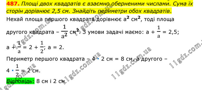 Площі двох квадратів є взаємно оберненими числами. Сума їх сторін дорівнює 2,5 см. Знайдіть периметри обох квадратів. Нехай площа першого квадрата дорівнює а2 см2, тоді площа другого квадрата – 1/а^2 см2. З умови задачі маємо: а + 1/а = 2,5; а + 1/а = 2 + 1/2; а = 2. Периметр першого квадрата – 4 ∙ 2 см = 8 см, а другого – 4 ∙ 1/2 = 2 см. Відповідь: 8 см і 2 см.