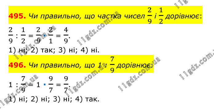 495. Чи правильно, що частка чисел 2/9 і 1/2 дорівнює: 2/9 : 1/2 = 2/9 ∙ 2/1 = 4/9. 1) ні; 2) так; 3) ні; 4) ні. 496. Чи правильно, що 1 : 7/9 дорівнює: 1 : 7/9 = 1 ∙ 9/7 = 9/7. 1) ні; 2) ні; 3) ні; 4) так.