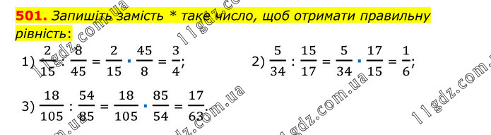 Запишіть замість * таке число, щоб отримати правильну рівність: 1) 2/15 : 8/45 = 2/15 ∙ 45/8 = 3/4; 2) 5/34 : 15/17 = 5/34 ∙ 17/15 = 1/6; 3) 18/105 : 54/85 = 18/105 ∙ 85/54 = 17/63.