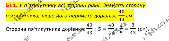 У п’ятикутнику всі сторони рівні. Знайдіть сторону п’ятикутника, якщо його периметр дорівнює 40/43 см. Сторона пя’тикутника дорівнює 40/43 : 5 = 40/43 ∙ 1/5 = 8/43 (см).