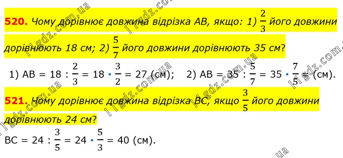 520. Чому дорівнює довжина відрізка AB, якщо: 1) 2/3 його довжини дорівнюють 18 см; 2) 5/7 його довжини дорівнюють 35 см? 1) АВ = 18 : 2/3 = 18 ∙ 3/2 = 27 (см); 2) АВ = 35 : 5/7 = 35 ∙ 7/5 = (см). 521. Чому дорівнює довжина відрізка ВC, якщо 3/5 його довжини дорівнюють 24 см? ВС = 24 : 3/5 = 24 ∙ 5/3 = 40 (см).