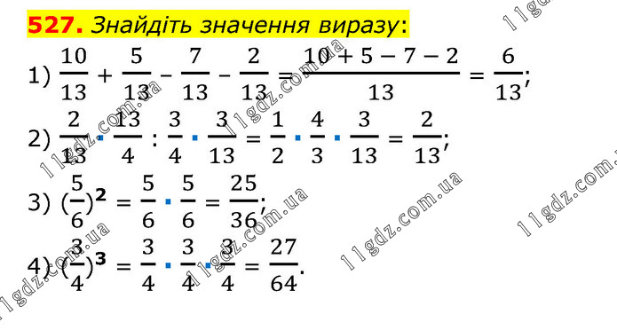 Знайдіть значення виразу: 1) 10/13 + 5/13 – 7/13 – 2/13 = (10 + 5 - 7 - 2)/13 = 6/13; 2) 2/13 ∙ 13/4 : 3/4 ∙ 3/13 = 1/2 ∙ 4/3 ∙ 3/13 = 2/13; 3) (5/6)2 = 5/6 ∙ 5/6 = 25/36; 4) (3/4)3 = 3/4 ∙ 3/4 ∙ 3/4 = 27/64.