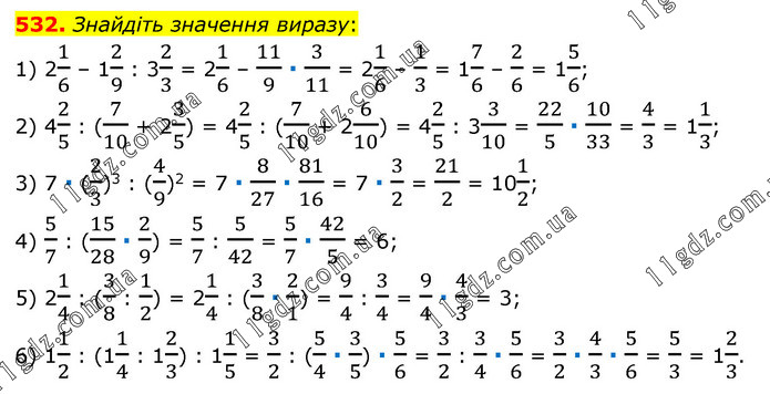 Знайдіть значення виразу: 1) 21/6 – 12/9 : 32/3 = 21/6 – 11/9 ∙ 3/11 = 21/6 – 1/3 = 17/6 – 2/6 = 15/6; 2) 42/5 : (7/10 + 23/5) = 42/5 : (7/10 + 26/10) = 42/5 : 33/10 = 22/5 ∙ 10/33 = 4/3 = 11/3; 3) 7 ∙ (2/3)3 : (4/9)2 = 7 ∙ 8/27 ∙ 81/16 = 7 ∙ 3/2 = 21/2 = 101/2; 4) 5/7 : (15/28 ∙ 2/9) = 5/7 : 5/42 = 5/7 ∙ 42/5 = 6; 5) 21/4 : (3/8 : 1/2) = 21/4 : (3/8 ∙ 2/1) = 9/4 : 3/4 = 9/4 ∙ 4/3 = 3; 6) 11/2 : (11/4 : 12/3) : 11/5 = 3/2 : (5/4 ∙ 3/5) ∙ 5/6 = 3/2 : 3/4 ∙ 5/6 = 3/2 ∙ 4/3 ∙ 5/6 = 5/3 = 12/3.