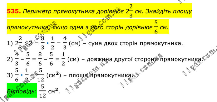 Периметр прямокутника дорівнює 22/3 см. Знайдіть площу прямокутника, якщо одна з його сторін дорівнює 5/6 см. 1) 22/3 : 2 = 8/3 ∙ 1/2 = 4/3 (см) – сума двох сторін прямокутника. 2) 4/3 – 5/6 = 8/6 – 5/6 = 1/2 (см) – довжина другої сторони прямокутника. 3) 5/6 ∙ 1/2 = 5/12 (см2) – площа прямокутника. Відповідь: 5/12 см2.