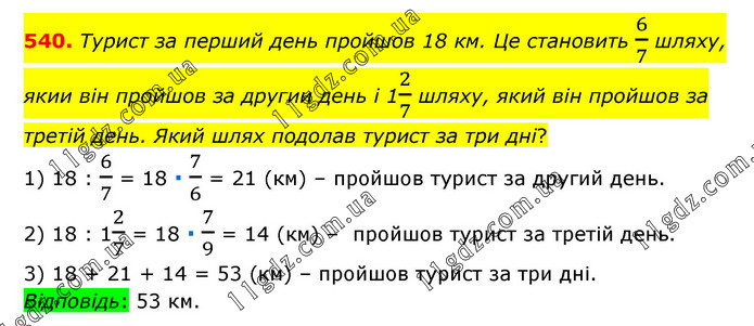 Турист за перший день пройшов 18 км. Це становить 6/7 шляху, якии він пройшов за другии день і 12/7 шляху, який він пройшов за третій день. Який шлях подолав турист за три дні? 1) 18 : 6/7 = 18 ∙ 7/6 = 21 (км) – пройшов турист за другий день. 2) 18 : 12/7 = 18 ∙ 7/9 = 14 (км) – пройшов турист за третій день. 3) 18 + 21 + 14 = 53 (км) – пройшов турист за три дні. Відповідь: 53 км.