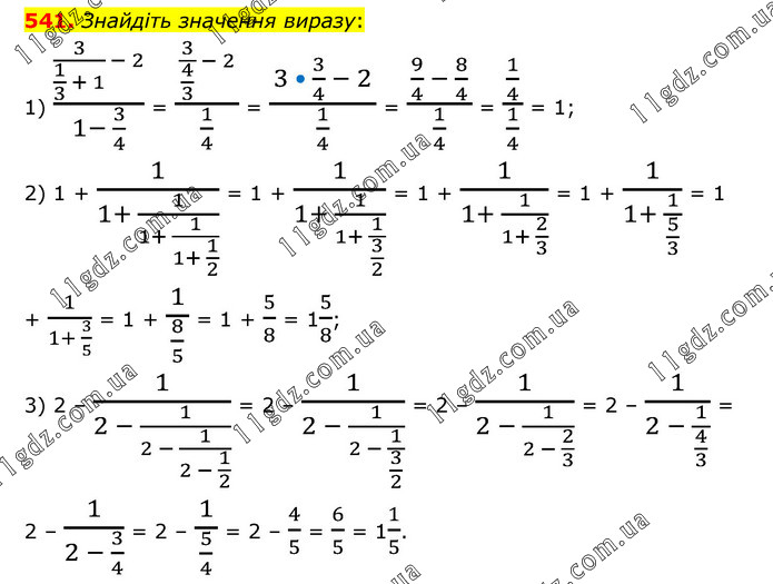 Знайдіть значення виразу: 1) □(3/(1/3 + 1) - 2)/(1- 3/4) = □(3/(4/3) - 2)/(1/4) = (3 • 3/4 - 2)/(1/4) = (9/4 - 8/4)/(1/4) = (1/4)/(1/4) = 1; 2) 1 + 1/(1+ 1/(1+ 1/(1+ 1/2))) = 1 + 1/(1+ 1/(1+ 1/(3/2))) = 1 + 1/(1+ 1/(1+ 2/3)) = 1 + 1/(1+ 1/(5/3)) = 1 + 1/(1+ 3/5) = 1 + 1/(8/5) = 1 + 5/8 = 15/8; 3) 2 – 1/(2 - 1/(2 - 1/(2 - 1/2))) = 2 – 1/(2 - 1/(2 - 1/(3/2))) = 2 – 1/(2 - 1/(2 - 2/3)) = 2 – 1/(2 - 1/(4/3)) = 2 – 1/(2 - 3/4) = 2 – 1/(5/4) = 2 – 4/5 = 6/5 = 11/5.