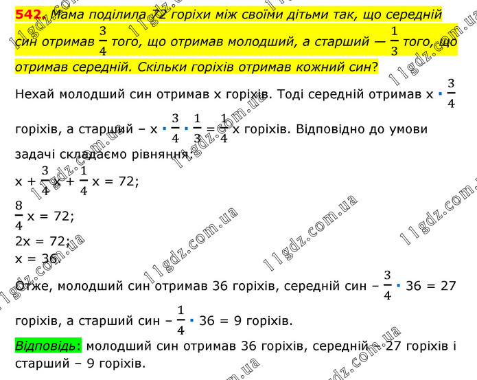 Мама поділила 72 горіхи між своїми дітьми так, що середній син отримав 3/4 того, що отримав молодший, а старший — 1/3 того, що отримав середній. Скільки горіхів отримав кожний син? Нехай молодший син отримав х горіхів. Тоді середній отримав х ∙ 3/4 горіхів, а старший – х ∙ 3/4 ∙ 1/3 = 1/4 х горіхів. Відповідно до умови задачі складаємо рівняння: х + 3/4 х + 1/4 х = 72; 8/4 х = 72; 2х = 72; х = 36. Отже, молодший син отримав 36 горіхів, середній син – 3/4 ∙ 36 = 27 горіхів, а старший син – 1/4 ∙ 36 = 9 горіхів. Відповідь: молодший син отримав 36 горіхів, середній – 27 горіхів і старший – 9 горіхів.