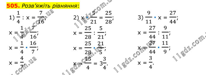 Розв’яжіть рівняння: 1) 1/4 : х = 7/16; х = 1/4 : 7/16; х = 1/4 ∙ 16/7; х = 4/7. 2) х ∙ 5/21 = 25/28; х = 25/28 : 5/21; х = 25/28 ∙ 21/5; х = 15/4 = 33/4. 3) 9/11 ∙ х = 27/44; х = 27/44 : 9/11; х = 27/44 ∙ 11/9; х = 3/4.