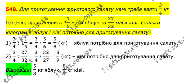 Для приготування фруктового салату мамі треба взяти 3/4 кг бананів, що становить 11/5 маси яблук та 27/32 маси ківі. Скільки кілограмів яблук і ківі потрібно для приготування салату? 1) 3/4 : 11/5 = 3/4 ∙ 5/6 = 5/8 (кг) – яблук потрібно для приготування салату. 2) 3/4 : 27/32 = 3/4 ∙ 32/27 = 8/9 (кг) – ківі потрібно для приготування салату. Відповідь: 5/8 кг яблук, 8/9 кг ківі.