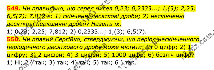 549. Чи правильно, що серед чисел 0,23; 0,2333...; 1,(3); 2,25; 6,5(7); 7,812 є: 1) скінченні десяткові дроби; 2) нескінченні десяткові періодичні дроби? Назвіть їх. 1) 0,23; 2,25; 7,812; 2) 0,2333...; 1,(3); 6,5(7). 550. Чи правий Сергійко, стверджуючи, що період нескінченного періодичного десяткового дробу може містити: 1) 0 цифр; 2) 1 цифру; 3) 2 цифри; 4) 3 цифри; 5) 1000 цифр; 6) безліч цифр? 1) Ні; 2 ) так; 3) так; 4) так; 5) так; 6 ) так.