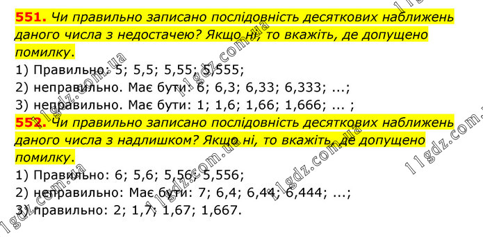 551. Чи правильно записано послідовність десяткових наближень даного числа з недостачею? Якщо ні, то вкажіть, де допущено помилку. 1) Правильно: 5; 5,5; 5,55; 5,555; 2) неправильно. Має бути: 6; 6,3; 6,33; 6,333; ...; 3) неправильно. Має бути: 1; 1,6; 1,66; 1,666; ... ; 552. Чи правильно записано послідовність десяткових наближень даного числа з надлишком? Якщо ні, то вкажіть, де допущено помилку. 1) Правильно: 6; 5,6; 5,56; 5,556; 2) неправильно: Має бути: 7; 6,4; 6,44; 6,444; ...; 3) правильно: 2; 1,7; 1,67; 1,667.