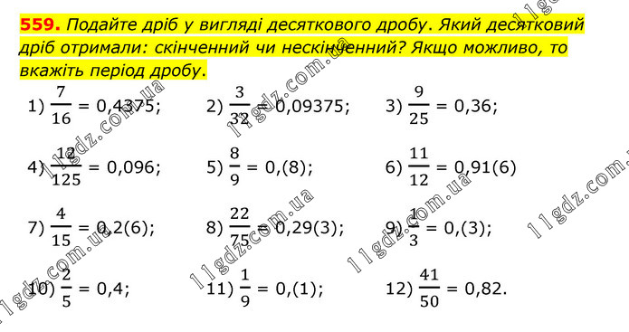 Подайте дріб у вигляді десяткового дробу. Який десятковий дріб отримали: скінченний чи нескінченний? Якщо можливо, то вкажіть період дробу. 1) 7/16 = 0,4375; 2) 3/32 = 0,09375; 3) 9/25 = 0,36; 4) 12/125 = 0,096; 5) 8/9 = 0,(8); 6) 11/12 = 0,91(6) 7) 4/15 = 0,2(6); 8) 22/75 = 0,29(3); 9) 1/3 = 0,(3); 10) 2/5 = 0,4; 11) 1/9 = 0,(1); 12) 41/50 = 0,82.