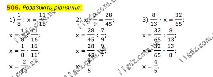 Розв’яжіть рівняння: 1) 1/8 : х = 11/16; х = 1/8 : 11/16; х = 1/8 ∙ 16/11; х = 2/11. 2) х ∙ 7/9 = 28/45; х = 28/45 : 7/9; х = 28/45 ∙ 9/7; х = 4/5. 3) 8/13 ∙ х = 32/65; х = 32/65 : 8/13; х = 32/65 ∙ 13/8; х = 4/5.