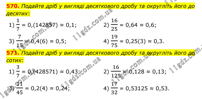 570. Подайте дріб у вигляді десяткового дробу та округліть його до десятих: 1) 1/7 = 0,(142857) ≈ 0,1; 2) 16/25 = 0,64 ≈ 0,6; 3) 7/15 = 0,4(6) ≈ 0,5; 4) 19/75 = 0,25(3) ≈ 0,3. 571. Подайте дріб у вигляді десяткового дробу та округліть його до сотих: 1) 3/7 = 0,(428571) ≈ 0,43; 2) 16/125 = 0,128 ≈ 0,13; 3) 11/45 = 0,2(4) ≈ 0,24; 4) 17/32 = 0,53125 ≈ 0,53.