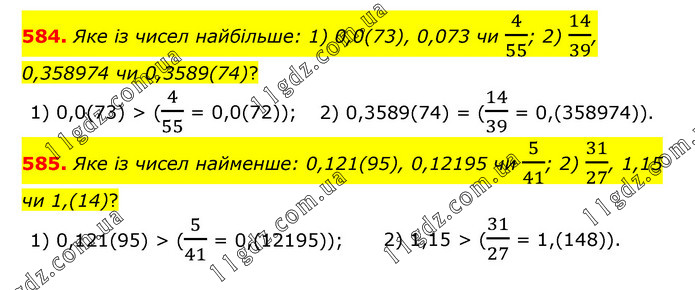 584. Яке із чисел найбільше: 1) 0,0(73), 0,073 чи 4/55; 2) 14/39, 0,358974 чи 0,3589(74)? 1) 0,0(73) > (4/55 = 0,0(72)); 2) 0,3589(74) = (14/39 = 0,(358974)). 585. Яке із чисел найменше: 0,121(95), 0,12195 чи 5/41; 2) 31/27, 1,15 чи 1,(14)? 1) 0,121(95) > (5/41 = 0,(12195)); 2) 1,15 > (31/27 = 1,(148)).