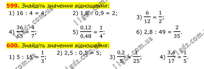 599. Знайдіть значення відношення: 1) 16 : 4 = 4; 2) 1,8 : 0,9 = 2; 3) 6/12 = 1/2; 4) 36/63 = 4/7; 5) 0,12/0,48 = 1/4; 6) 2,8 : 49 = 2/35. 600. Знайдіть значення відношення: 1) 5 : 15 = 1/3; 2) 2,5 : 0,5 = 5; 3) 0,2/5 = 1/25; 4) 3,4/17 = 1/5.