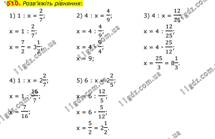 Розв’яжіть рівняння: 1) 1 : х = 2/7; х = 1 : 2/7; х = 7/2 = 31/2; 2) 4 : х = 4/9; х = 4 : 4/9; х = 4 ∙ 9/4; х = 9; 3) 4 : х = 12/25; х = 4 : 12/25; х = 4 ∙ 25/12; х = 25/3 = 81/3. 4) 1 : х = 22/7; х = 1 : 16/7; х = 7/16; 5) 6 : х = 22/5; х = 6 : 12/5; х = 6 ∙ 5/12; х = 5/2 = 21/2.
