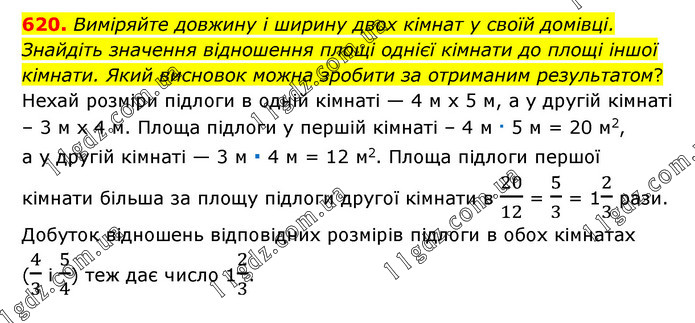 Виміряйте довжину і ширину двох кімнат у своїй домівці. Знайдіть значення відношення площі однієї кімнати до площі іншої кімнати. Який висновок можна зробити за отриманим результатом? Нехай розміри підлоги в одній кімнаті — 4 м х 5 м, а у другій кімнаті – 3 м х 4 м. Площа підлоги у першій кімнаті – 4 м ∙ 5 м = 20 м2, а у другій кімнаті — 3 м ∙ 4 м = 12 м2. Площа підлоги першої кімнати більша за площу підлоги другої кімнати в 20/12 = 5/3 = 12/3 рази. Добуток відношень відповідних розмірів підлоги в обох кімнатах (4/3 і 5/4) теж дає число 12/3.