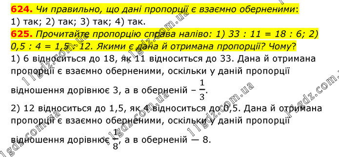 624. Чи правильно, що дані пропорції є взаємно оберненими: 1) так; 2) так; 3) так; 4) так. 625. Прочитайте пропорцію справа наліво: 1) 33 : 11 = 18 : 6; 2) 0,5 : 4 = 1,5 : 12. Якими є дана й отримана пропорції? Чому? 1) 6 відноситься до 18, як 11 відноситься до 33. Дана й отримана пропорції є взаємно оберненими, оскільки у даній пропорції відношення дорівнює 3, а в оберненій – 1/3. 2) 12 відноситься до 1,5, як 4 відноситься до 0,5. Дана й отримана пропорції є взаємно оберненими, оскільки у даній пропорції відношення дорівнює 1/8, а в оберненій — 8.